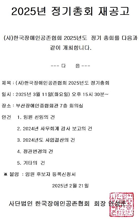 2025년도 정기총회 재공고 페이지 정보 작성자 관리자 작성일 2025.02.20 15:53 298 조회 목록 본문 2025년도 한국장애인공존협회 정기총회 재공고 SNS 공유 신고 차단 첨부 붙임1-임원후보자등록서.hwp 파일크기 (43.5K) 2 회 다운로드 등록일 2025.02.20 15:53 댓글 0 로그인한 회원만 댓글 등록이 가능합니다. 이전글 다음글 목록