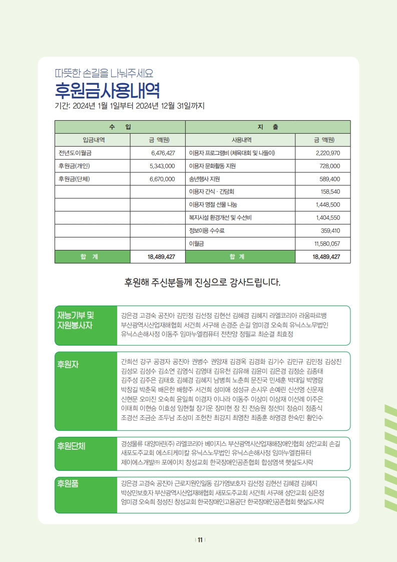 한국장애인공존협회공존직업재활센터 2024년도 결산서 및 후원금 사용내역 공개