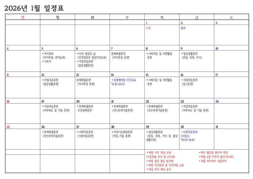 공존직업재활센터 2026년 1월 일정표 페이지 정보 작성자 관리자 작성일 2025.12.30 11:42 245 조회 목록 본문 공존직업재활센터 2026년 1월 일정표 SNS 공유 신고 차단 댓글 0 로그인한 회원만 댓글 등록이 가능합니다. 이전글 다음글 목록