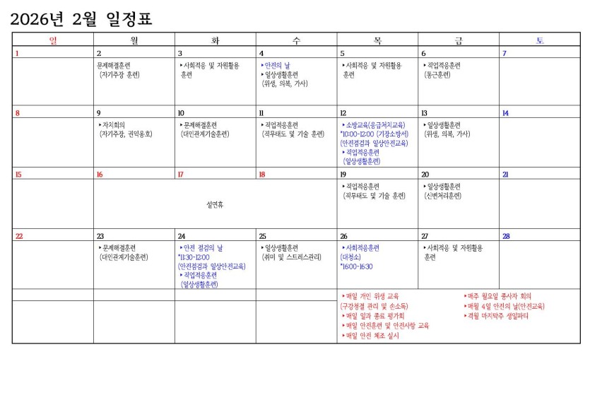 공존직업재활센터 2026년 2월 일정표 페이지 정보 작성자 관리자 작성일 2026.02.05 09:32 158 조회 목록 본문 공존직업재활센터 2026년 2월 일정표 SNS 공유 신고 차단 댓글 0 로그인한 회원만 댓글 등록이 가능합니다. 이전글 다음글 목록